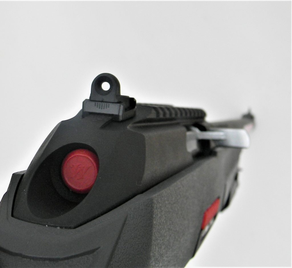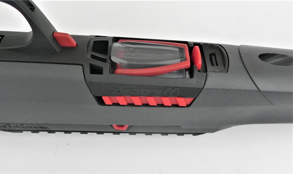 When I look over a rifle I like to consider sighting equipment first. The Wildcat features plenty of rail for mounting red dot sights or a rimfire scope. The rifle also features a well designed aperture rear sight. The front sight is the tear drop style, tapering to the slightly rain drop top. This sight is very easy to use well and makes for rapid sight acquisition. The rest of the rifle isn’t conventional at all. The stock is a composite but feels solid in the hand. There is mounting hardware to mount a laser forward if need be. If you run into a bobcat, feral dog or other nasty things around the campsite a laser or light will come in handy. The Wildcat like all .22 self loaders is blowback operated. The rifle, however, is striker fired. This makes for a rapid lock time. Winchester made a wise decision in designing the rifle to accommodate Ruger 10/22 magazines. This means extended magazines are readily available. The Winchester magazine is easily loaded. A special wheel on the magazine body is depressed to allow for easy loading. During the test and evaluation I used several Ruger X magazines with good to excellent results. While the magazine is easy to load the magazine release is an even more interesting model of engineering. There is a conventional magazine release but also a large release, with components on either side of the stock, that is pressed to release the magazine. There are quite a few human engineering drawbacks in other rifles neatly solved by the Wildcat. The bolt holds open on the last shot. The bolt release is well designed. The safety is a crossbolt, the barrel is eighteen inches long.