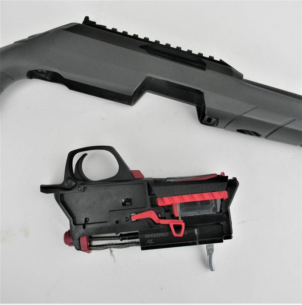 The most interesting piece of engineering in this modular design is field stripping the rifle. Be certain the magazine is removed. Clear the chamber- then check again. There is a red knob visible in the rear of the receiver. Press this knob in with the forefinger. At the same time, with the other hand, pull the trigger guard downward. The main action then pulls out of the stock. The cocking handle folds out of the ways as field strip is accomplished. This system makes cleaning simple. The chamber may be easily cleaned from the rear of the rifle. Despite modern improvements in gun powder .22 Long Rifle ammunition is dirtier than most. Powder ash and even the lubricant found on the heel based bullet eventually cruds up an action. There is nothing easier to clean and maintain than the Wildcat save perhaps a single shot rifle. The package weighs four pounds unloaded. This is a neat little rifle that doesn’t become a burden hunting all day and stores easily in the truck.