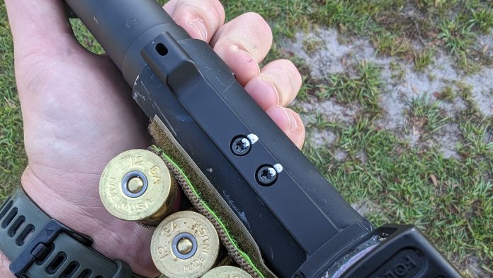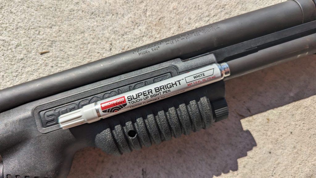 Everywhere! Really, on anything that’s threaded onto your shotgun. This includes sights, optic rails, optics, magazine extensions, bolt release extensions, and beyond. If it has threads, a small witness mark finds a spot. I use a Birchwood Casey paint pen, and I don’t go too overboard with the entire thing. It’s just a mark big enough to see.