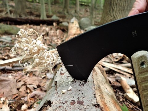 The second test I usually conduct is to evaluate how the edge geometry of the tool performs when shaving dry wood for fire preparation. Many people familiar with making feather sticks for starting a fire using a tomahawk, hatchet, or axe tend to grip the tool like a knife—this can feel cumbersome due to the excess weight and lack of control.
