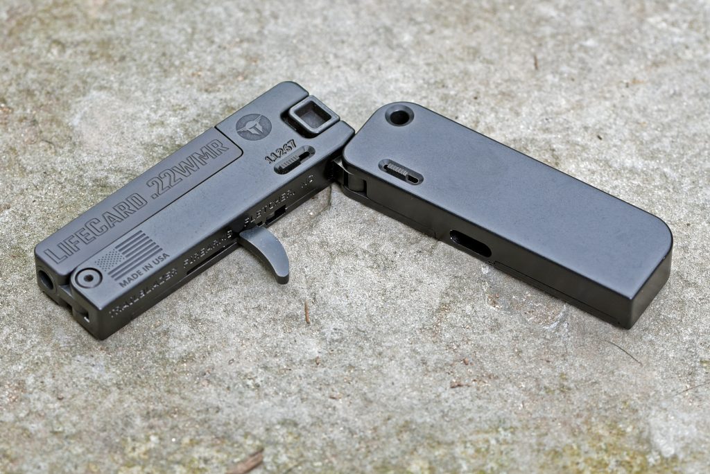 A single barrel, single-shot handgun that folds up to about the dimensions of a credit card and is just about a half of an inch thick. LifeCard only weighs 7oz. The entire gun is made of metal. The barrel, bolt, and trigger are made from 4140 pre-hardened steel and the frame and handle is made from billet aluminum. The package is coated in a very attractive black Corrosion Resistant Isonite and the aluminum is anodized. Its design is extremely clean and extremely subdued until you flip the latch to open it.