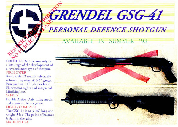 Our last weird Grendel is a bullpup shotgun, but it’s not your mama’s KSG. It’s a .410, with a magazine, in a bullpup format. The design was produced but never beyond the prototype stage. It was a pump-action and looked a bit like the RDB Survival rifle. The magazine held 12 rounds of 3-inch .410 rounds.