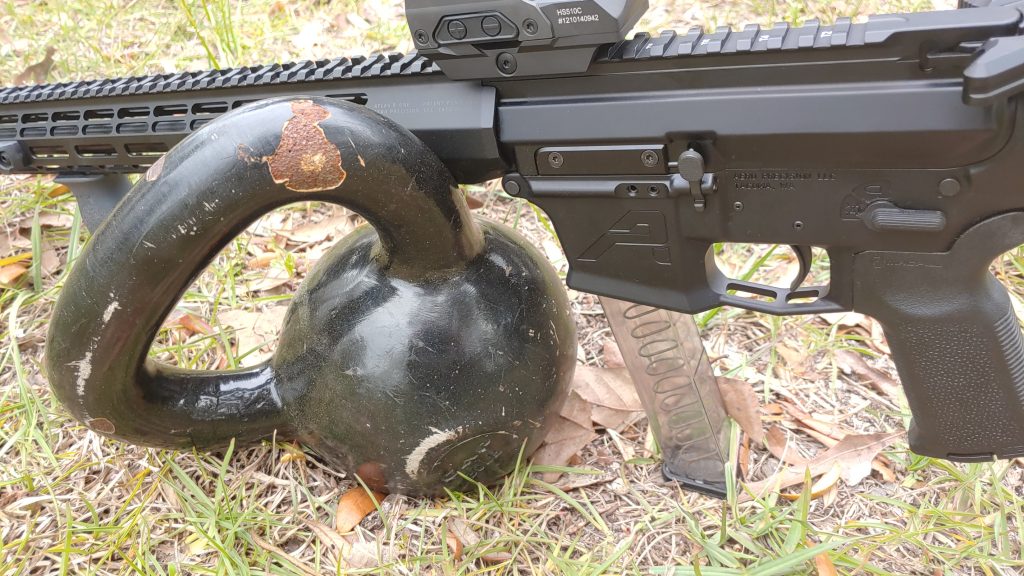 At the buzzer, the shooter will go prone next to the kettlebell and acquire one hit on the target.
