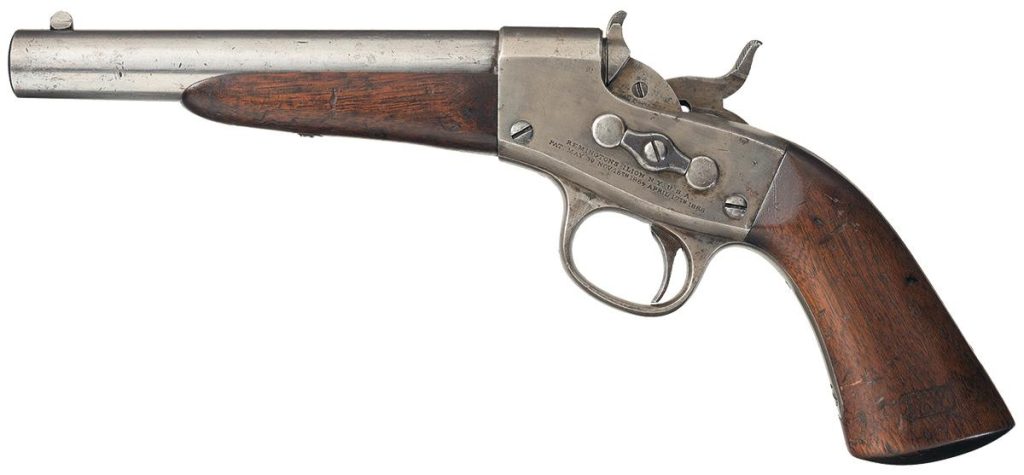 Metallic cartridge pistols were tricky in this era. Rollin White and S&W held the patent of revolvers loaded through the cylinder and guarded it with a great jealousy. Metallic cartridge revolvers were the sole dominion of S&W, and Remington couldn’t produce any without a different design. It seemed easy to look at the Rolling Block rifle design and produce a metallic cartridge pistol from it.