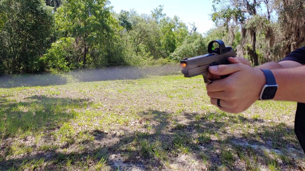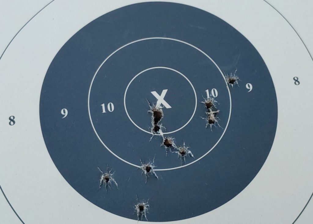 At 50 yards I set up a B8 target. I fired five rounds in the standing position slowly and precisely. Could I have done better? Sure, but I feel satisfied with landing every round in the eight ring. Red dots on handguns make it so much easier to hit targets at these longer handgun ranges.