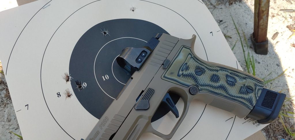 After a quick zero of the Romeo1Pro, I started with one of my favorite drills, the 10-10-10 drill. You can read about that here, so I don’t have to explain the whole thing. I’ve shot the 10-10-10 drill quite a few times and have gotten rather good at it. This was the first time I’ve shot it with the dot and with the SIG AXG.