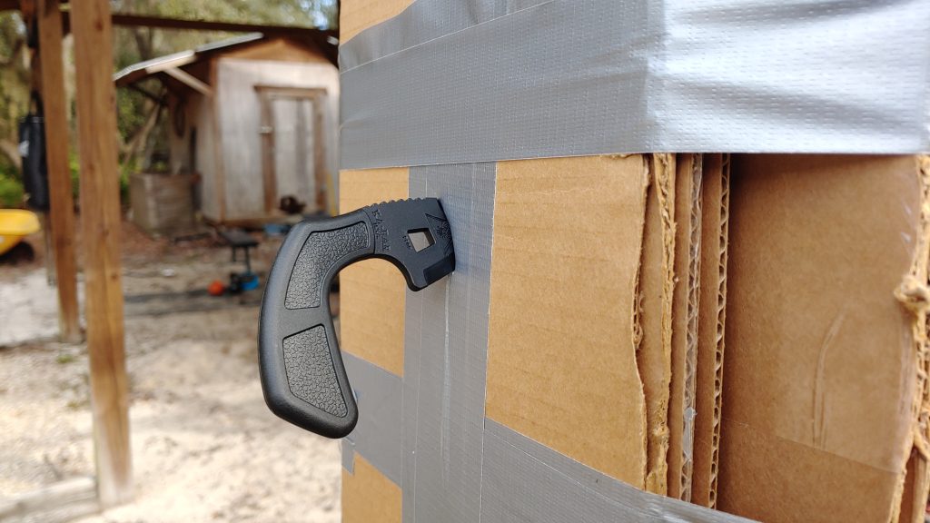 The blade’s 2.6-inch length isn’t much, but it will penetrate and stick pretty well. I piled up several layers of cardboard, posted them against a pole, and went after it. I struck and punched the cardboard repeatedly with the Sharkbite. The Sharkbite penetrated deeply and surprisingly easily. Like Doom guy, it rips and tears until it is done.