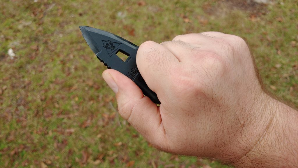 That is where the Sharkbite shines. It’s a weapon and will likely fall under your state’s knife laws. Most knife laws are laxer than gun laws, so carrying this in various places where a gun is a no go is it’s the best strength. The Sharkbite certainly has some bite for a polymer weapon and delivers a good bit of pain for a plastic knife.